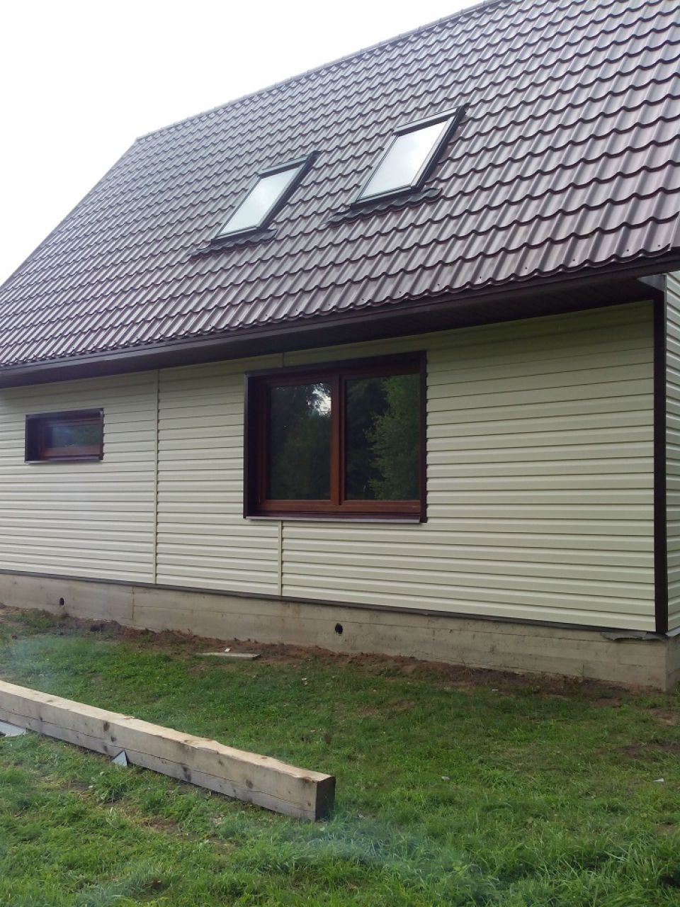 Облицовка частного дома в поселке Наумки сайдингом Дёке (цвет сливки) , облицовка окон фасонными элементами индивидуального изготовления металл - цвет 8017(коричневый), утепление 100 мм плитным базальтовым утеплителем Хотрок Лайт.