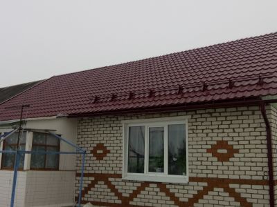 Комплекс кровельных работ. Демонтаж старого кровельного покрытия (шифер), укладка гидроизоляции Optima D, монтаж обрешётки и контробрешётки, выравнивание плоскости скатов кровли, монтаж металлочерепицы Grand Line Классик 0,5 PE Satin RAL 3005 с фурнитурой, монтаж карнизной вентиляционной ленты ПВХ Grand Line, отделка карнизов кровли виниловым сайдингом Grand Line Золотой песок, монтаж оклада трубы, монтаж винилового сайдинга (отделка фронтона) Grand Line Золотой песок, монтаж чердачной вентиляционной решётки с сеткой, монтаж водосточной системы Grand Line RAL 3005, монтаж трубчатых снегозадержателей NEW Grand Line RAL 3005, монтаж защитного козырька Krovent.