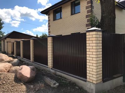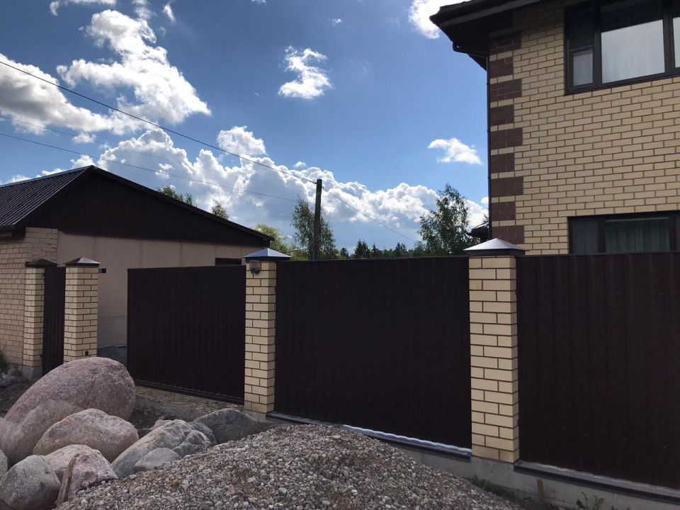 Откатные ворота, колонны из облицовочного кирпича, двухсторонний профлист